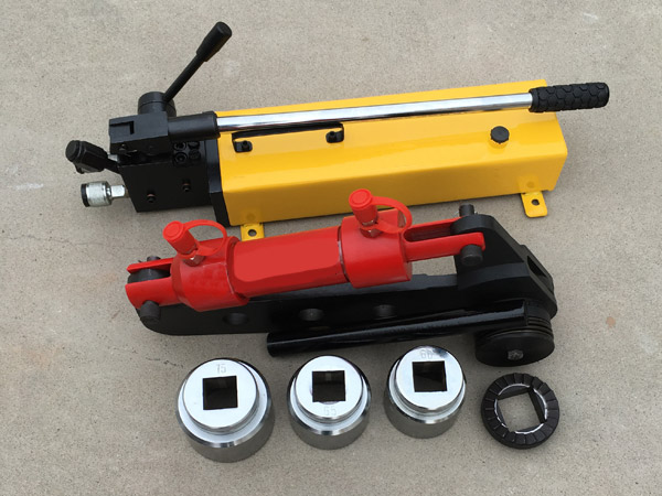 手動高壓泵由操縱手柄,高壓泵、換向閥、油箱、壓力表和帶快速接頭的輸油管等組成。帶棘輪式液壓扳手由高壓油口、液壓油缸、曲柄、反力桿、棘輪裝置、套筒等組成、前者系動力源部件,后者為扭矩執(zhí)行機(jī)構(gòu)。
